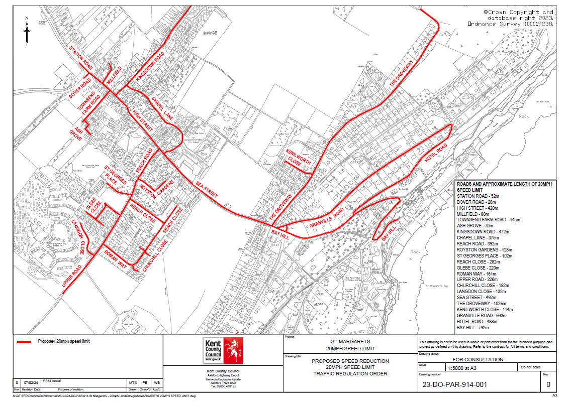 The effect of this proposed Order would be to reduce the current speed limit from 30mph to 20mph on the following lengths of roads in St Margarets at Cliffe, Dover:-