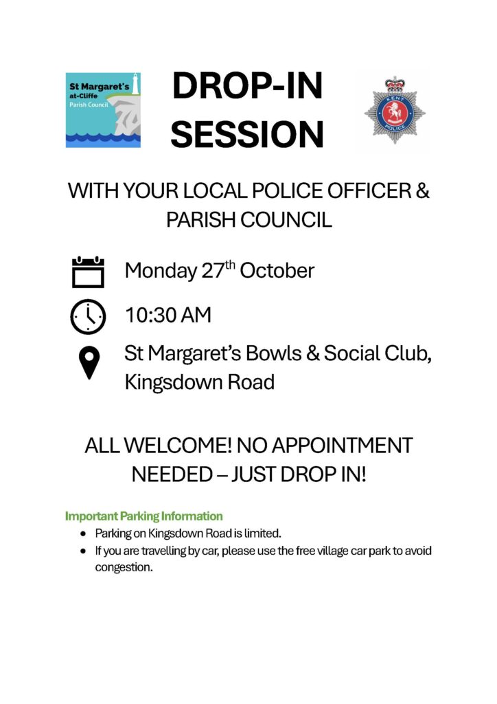 DROP-IN SESSION WITH YOUR LOCAL POLICE OFFICER & PARISH COUNCIL Monday 27th October 10:30 AM St Margaret’s Bowls & Social Club, Kingsdown Road ALL WELCOME! NO APPOINTMENT NEEDED – JUST … Continue reading Community Engagement Event