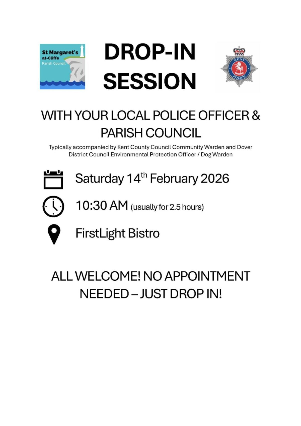 FirstLight 1-3 The Droveway, St Margarets Bay, United KingdomTypically accompanied by Kent County Council Community Warden and Dover District Council Environmental Protection Officer / Dog Warden Saturday 14th February 2026 10:30 AM (usually for 2.5 hours) FirstLight Bistro